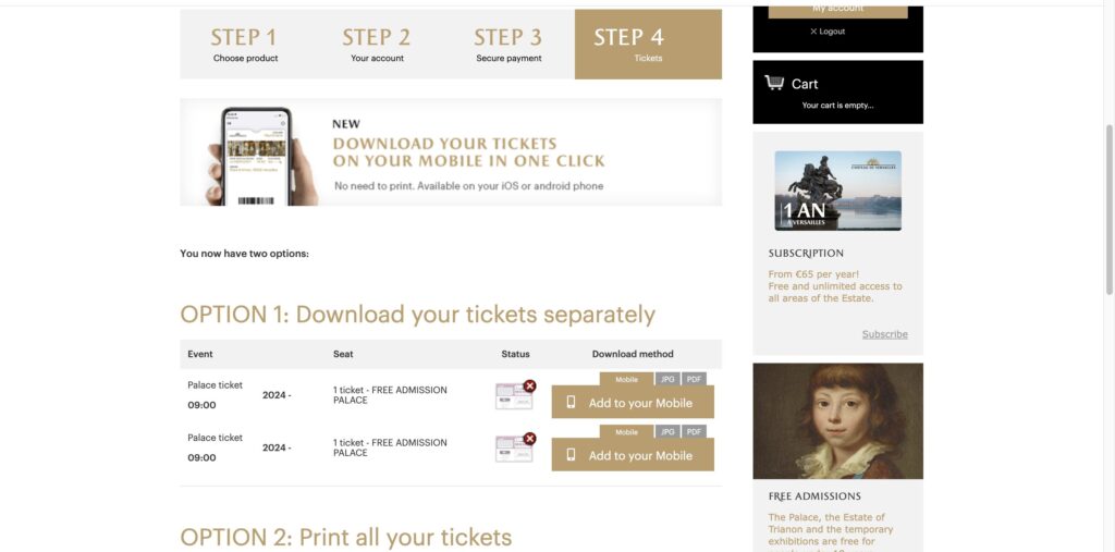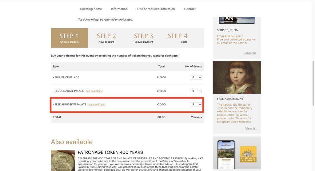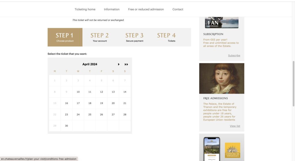 1. ヴェルサイユ宮殿の公式サイトから、「PALACE TICKET」を選択