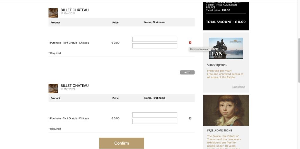 3. FREE ADMISSION PALACEを人数分選択。
